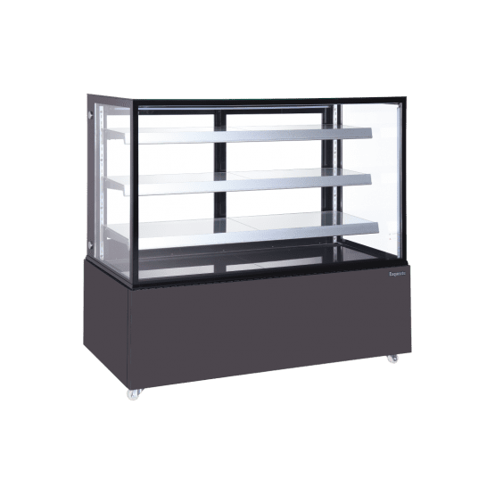 Three adjustable glass shelves enclosed with glass top, sides and sliding rear doors. Open-top bottom shelf to allow customers to serve themselves.