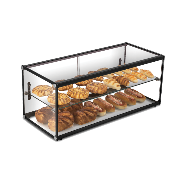 Exquisite CD120 Double Tiers Flat Glass Ambient Cake Display 120 Litre. Attractive design, glass base, flat pack, easy to clean base, sliding door design for easy opening. Square glass, double tiers layout, double sliding door opening. For placement on top of bench or near counter area for easy access. Available in 4 other sizes: 48 (single tier), 65 (double tiers), 68 (single tier) and 90 (double tiers).