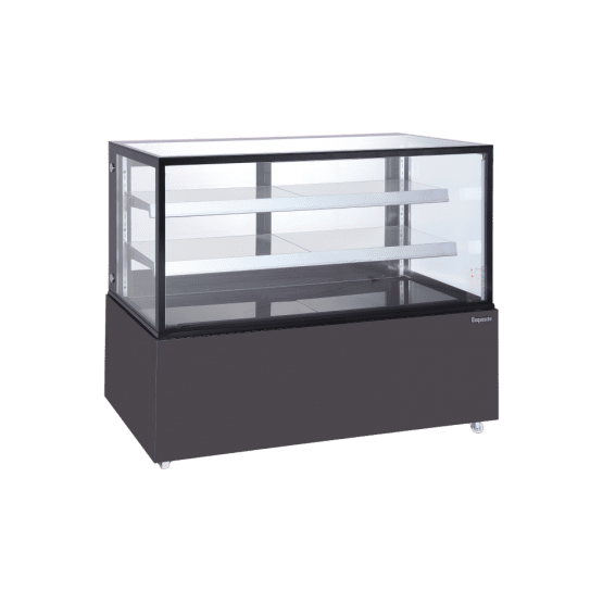 Exquisite CDR212 Three Tiers Cake Display Refrigerators 1200mm Width with gross volume 370 Litre. Double glazed glass door for maximum insulation, digital controller and temperature display, dynamic fan forced cooling system with automatic defrosting, black stainless steel finish, frosted glass shelves, sliding door, internal LED light, using R290 gas, temperature set range 2 to 6 Celcius. Warranty: 12 months parts and labour, Australia wide.