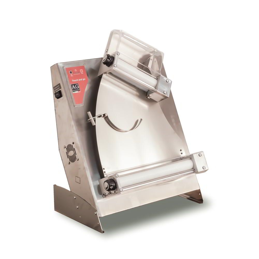 The AG Equipment TOUCH AND GO dough roller is equipped with a unique patented design automation system where the machine is equipped with touch sensors that automatically starts the roller when the operator puts the dough onto the machine.