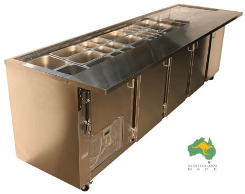 VIP designed and manufactured to customers request to operate in the kitchen where there is a hot environment, with see through sliding perspex lids over the pots to assist in maintaining correct temperature.